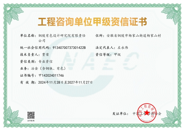 工程設(shè)計(冶金行業(yè)甲級)資質(zhì)證書